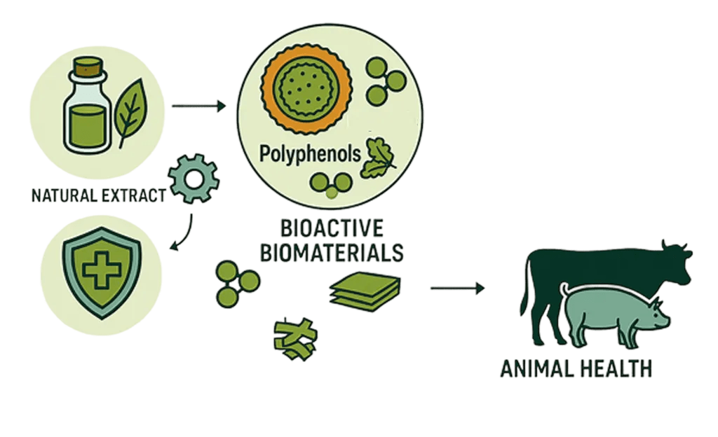 This research line focuses on the development of bioactive biomaterials derived from natural plant extracts to provide antimicrobial and antioxidant protection in livestock. These materials are designed to support animal health in species such as cattle, pigs and fish, offering an effective alternative to conventional antibiotics.